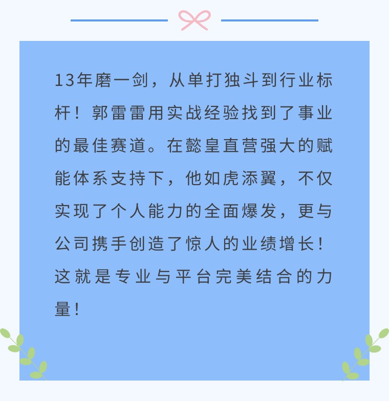 在此,我們也想對在外奮斗的家人們說,如果你們也面臨與郭雷雷相似的困擾,那么擁有 20 年深厚底蘊、成熟企業文化與強大支撐賦能體系的懿皇地產,定能為你排憂解難,成為你事業騰飛的堅實后盾!